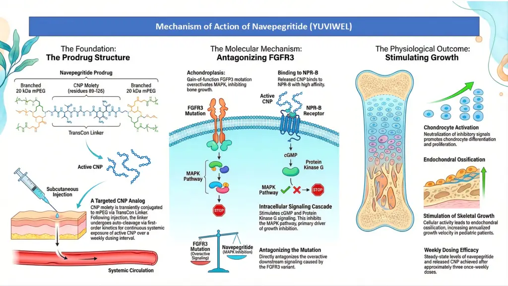 Navepegritide (YUVIWEL) is a once-weekly subcutaneous injection designed to enhance linear growth in pediatric patients aged two and older who have achondroplasia and open growth plates(ephiphyses). This C-type natriuretic peptide (CNP) analog works by stimulating bone growth and was granted accelerated approval based on its ability to improve growth velocity in clinical trials.